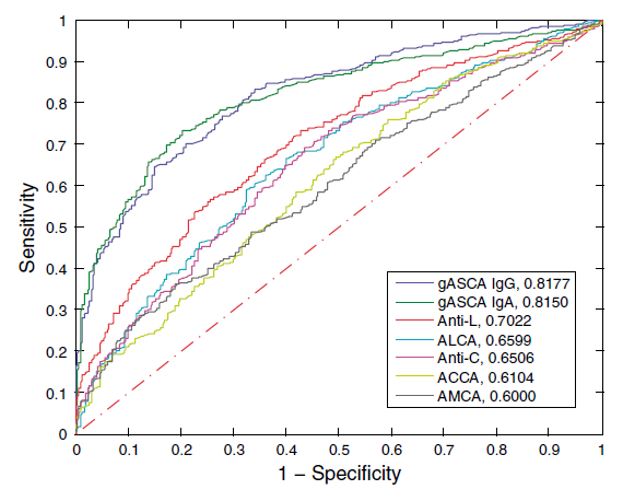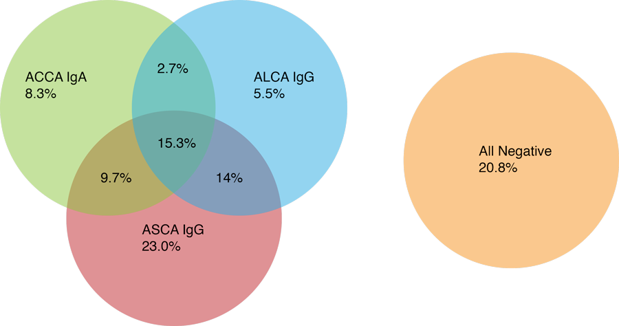 As of 2016, the IBDX panel biomarkers: gASCA, ALCA, ACCA, AMCA, Anti-L and Anti-C were